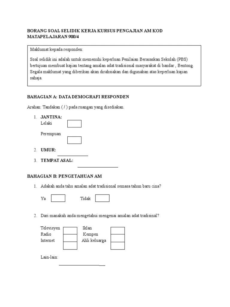 Doc borang soal selidik kerja kursus pengajian am kod mata pelajaran 900 4 . Contoh borang kaji selidik pengajian am stpm penggal 2.